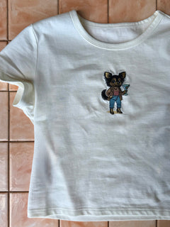 Elevate your casual style with a playful twist. The Nina Martini Tee is crafted from soft, premium cotton and features a unique embroidered design: a chic, stylish chihuahua with a cocktail in paw.