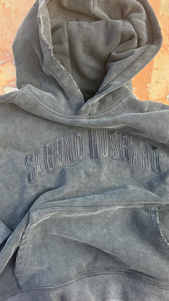 The Second Husband Classic Hoodie is an oversized essential made from midweight 100% cotton fleece. Designed for both comfort and character, it features a SECOND HUSBAND graphic at the chest in tonal collegiate embroidery. Subtle grinding along the edges of the hood, sleeve cuffs, and waistband adds a perfectly broken-in, vintage finish. A functional kangaroo pocket at the front completes the look — practical, easy, and effortless.